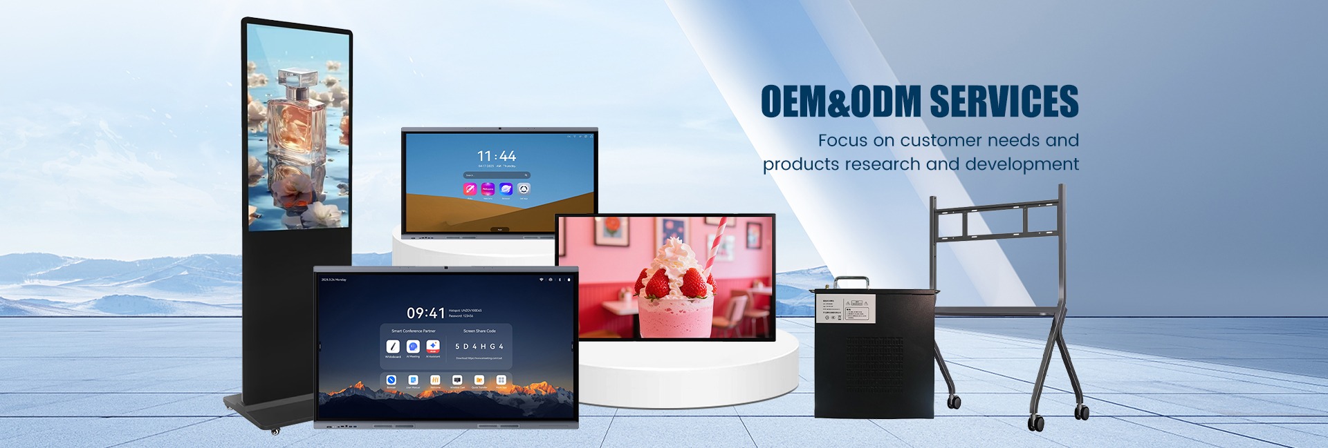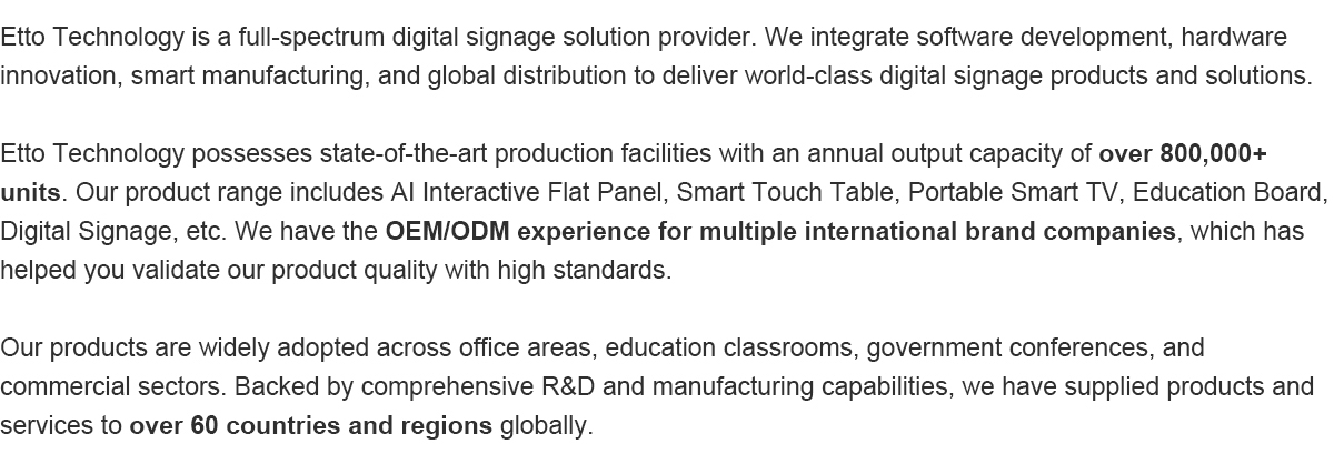 Productos principales:Panel interactivo, Pizarra Interactiva, señalización digital, mesa táctil, Smart TV portátil